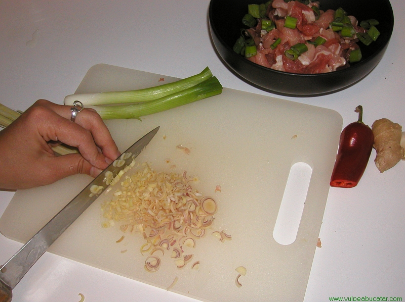 Se taie carnea de porc in fasii de 5 cm lumgime si 1 am latime. Se toaca marunt lemongrass-ul, iar ceapa verde se taie in bucatele de 1-2 cm. Se amesteca bine, bine carnea cu lemongrass-ul, ceapa, sarea si piperul. Se lasa 30 de minute sa se marineze.2