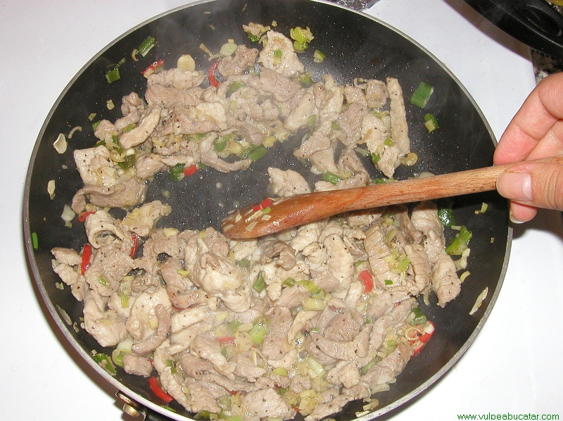 Se incinge uleiul intr-o tigaie sau in wok si se pune carnea de porc marinata la prajit. Se tine la foc mediu-mare (aragaz 6-7) 3-5 minute.4