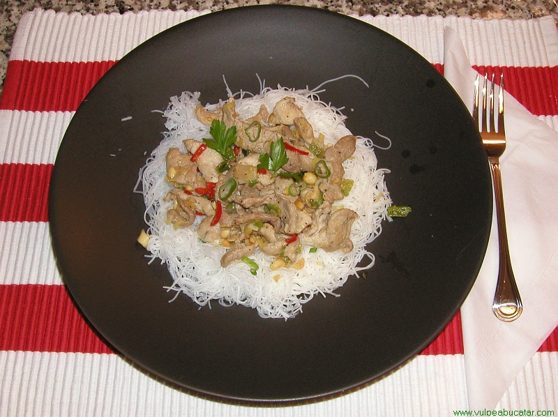 Se poate servi alaturi de taitei din orez cu sos dulce-acrisor.